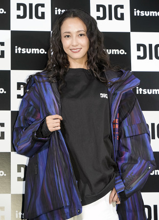 新スポーツアパレルブランド「DIG(ディグ)」の発表会見にブランドアンバサダーの沢尻エリカさんが登壇。大きなサイズのスノーウェアを身につけ「とても着心地がいい」とPR=10日、都内 【時事通信フォト】