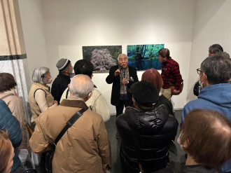 複合施設「丘の上結いスクエア」(飯田市東和町)1階エントランスに1月3日から、飯田高校(飯田市上郷)の書道班による作品「迎春」が展示されている。