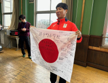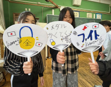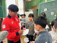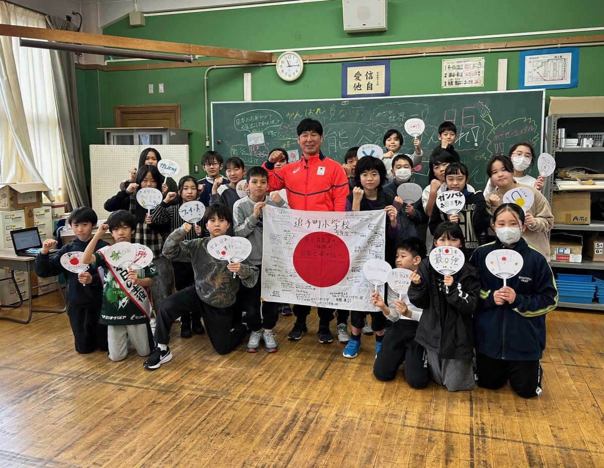 追手町小学校(飯田市追手町)の5年生24人が2月25日、ミラノ・コルティナ冬季パラリンピックのパラアイスホッケー日本代表キャプテンで、高森町在住の熊谷昌治選手を学校に迎え、激励会を開いた。