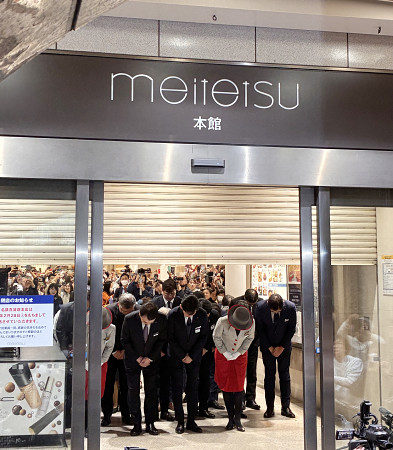 名古屋駅前の顔として親しまれてきた「名鉄百貨店」が28日閉店し、71年余りの歴史に幕を閉じた。写真は最後のあいさつをする名鉄百貨店の社員ら=名古屋市 【時事通信社】