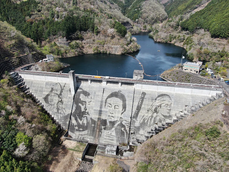 栃木県足利市の松田川ダムで、高圧洗浄機を使って侍の肖像を描く「ダムアート」の制作が大詰めを迎えている=9日、小型無人機で撮影 【時事通信社】