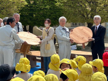 飯田市松川入財産区が4月17日、明星保育園(飯田市鼎切石)で木製ベンチなどの贈呈式を行った。
