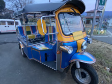 青野さんは以前、タイ旅行に行った際、楽しい雰囲気だったタクシーの「トゥクトゥク」の導入を検討。「飯田では初めて」というインパクトのある「トゥクトゥク」は660CCの3人乗り。青、赤、黄色などの多彩な色のトライク(オート3輪)。青野さんは「電飾も施してもらい派手になった」と目を細める。「実用的というより、イベントの際に出張して花をを添えるなど社会貢献的な使い方ができたらいい」とも。