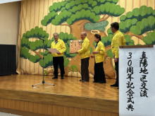 三穂地区では、阪神淡路大震災でのボランティア活動をきっかけに神戸市長田区真陽と1996(平成8)年2月に交流を開始。両地区で開催するイベントへ招待し合うなど親交を深めてきた。今年で30年を迎えたことから記念式典を実施。真陽地区の「ふれあいのまちづくり協議会」から4人が出席し、三穂まちづくり委員会から感謝状や記念品などを贈った。