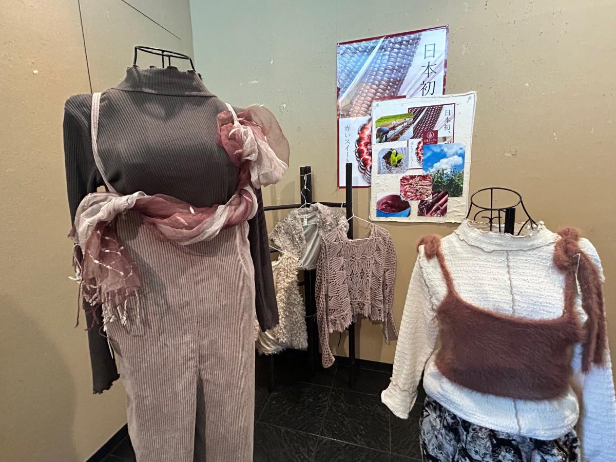 リユースの洋服やマフラー、シルク、麻、木綿など50~60点ほどを展示販売