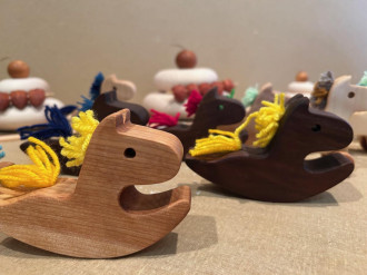木工作品を手がける「工房菜や(ななや)」(阿智村智里)の展示会「お正月展」が12月19日、アートハウス(飯田市上郷)で始まった。