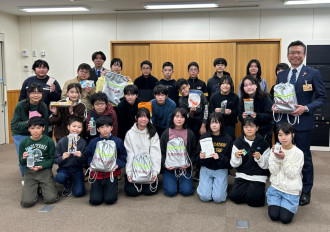 追手町小学校(飯田市追手町)の6年生25人が2月6日、飯田市役所を訪問し、5個の「防災バッグ」を寄贈した。