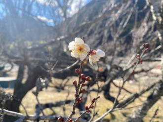 信州に春を告げる天龍村の「鶯巣(うぐす)梅園」(天龍村鶯巣)で1月28日、竜峡小梅の花が開花した。