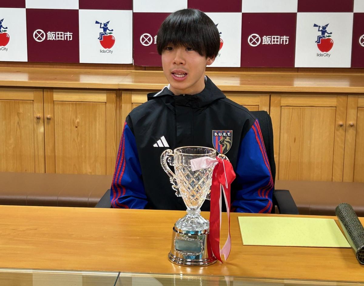 飯田市出身で創価大学(東京都八王子市)3年の小池莉希選手が1月6日、飯田市役所を表敬訪問し、箱根駅伝6区での「区間賞」受賞を報告した。