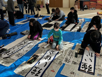 橋北公民館(飯田市江戸町)で1月4日、恒例行事「書き初め・正月遊び体験」が行われた。