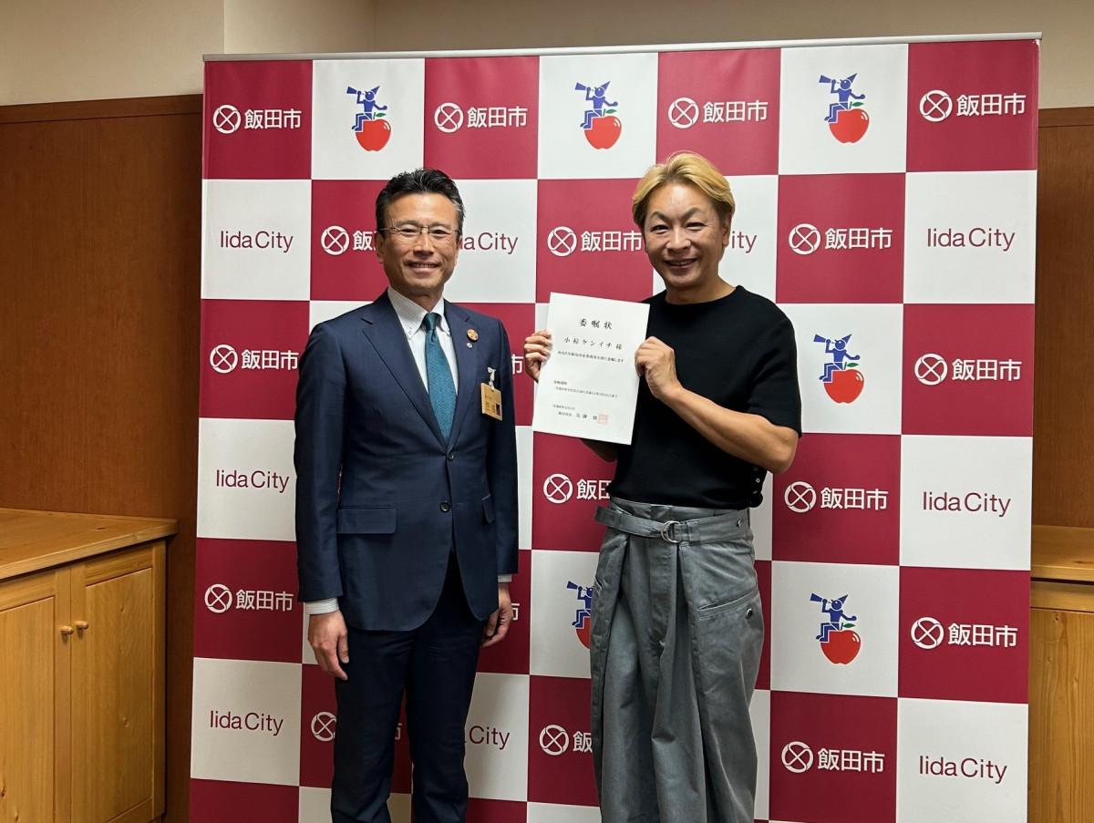 飯田出身で、「おぐねー」の愛称で知られるヘアメーキャップアーティスト、小椋ケンイチさんの飯田市産業親善大使任期満了に伴い、飯田市は4月1日、小椋さんに5期目の委嘱状を交付した。