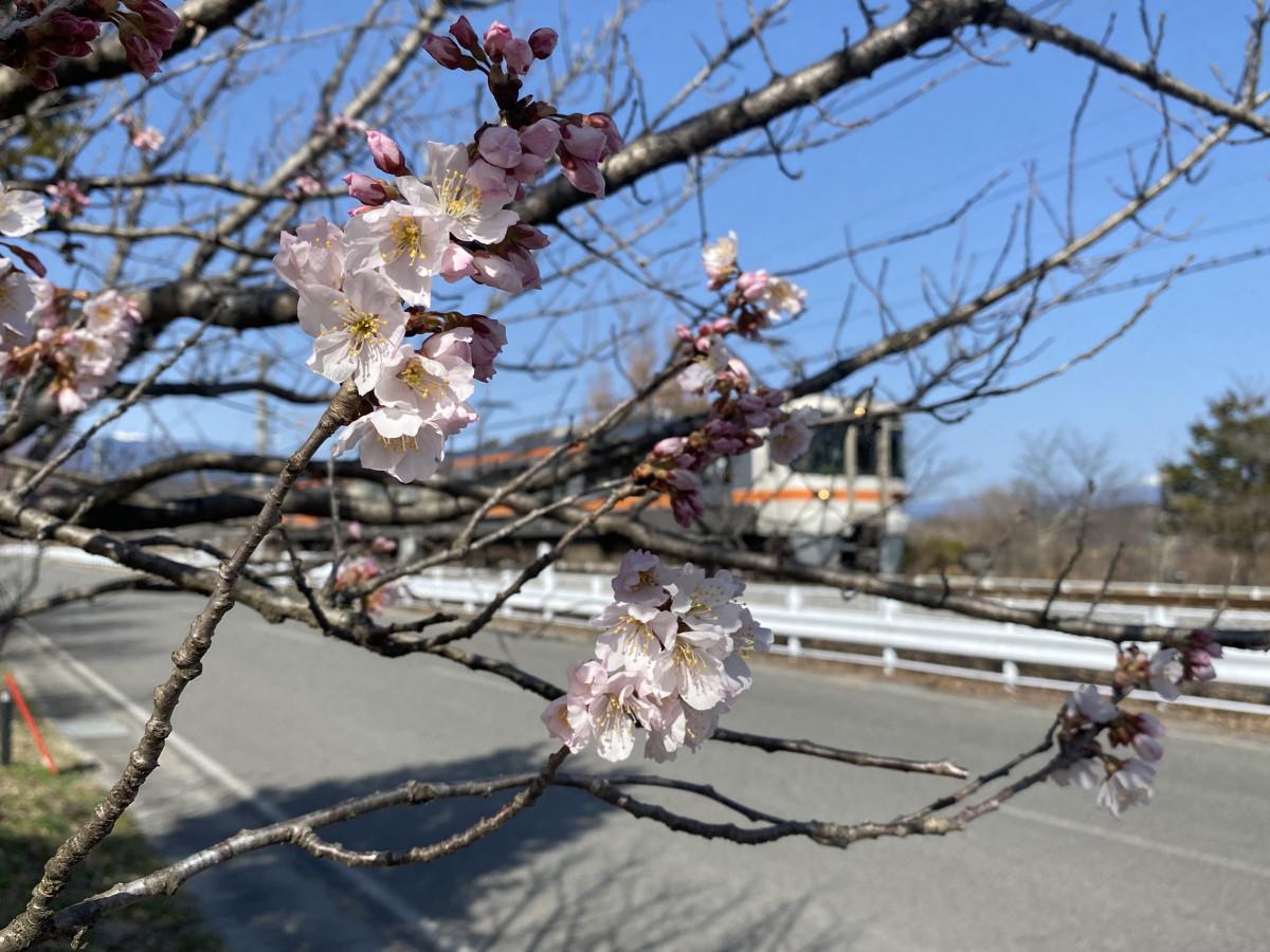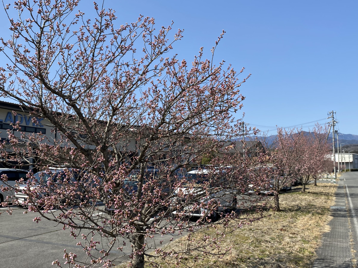飯田市川路バイパス周辺の「春めき桜」が咲き始めた。