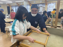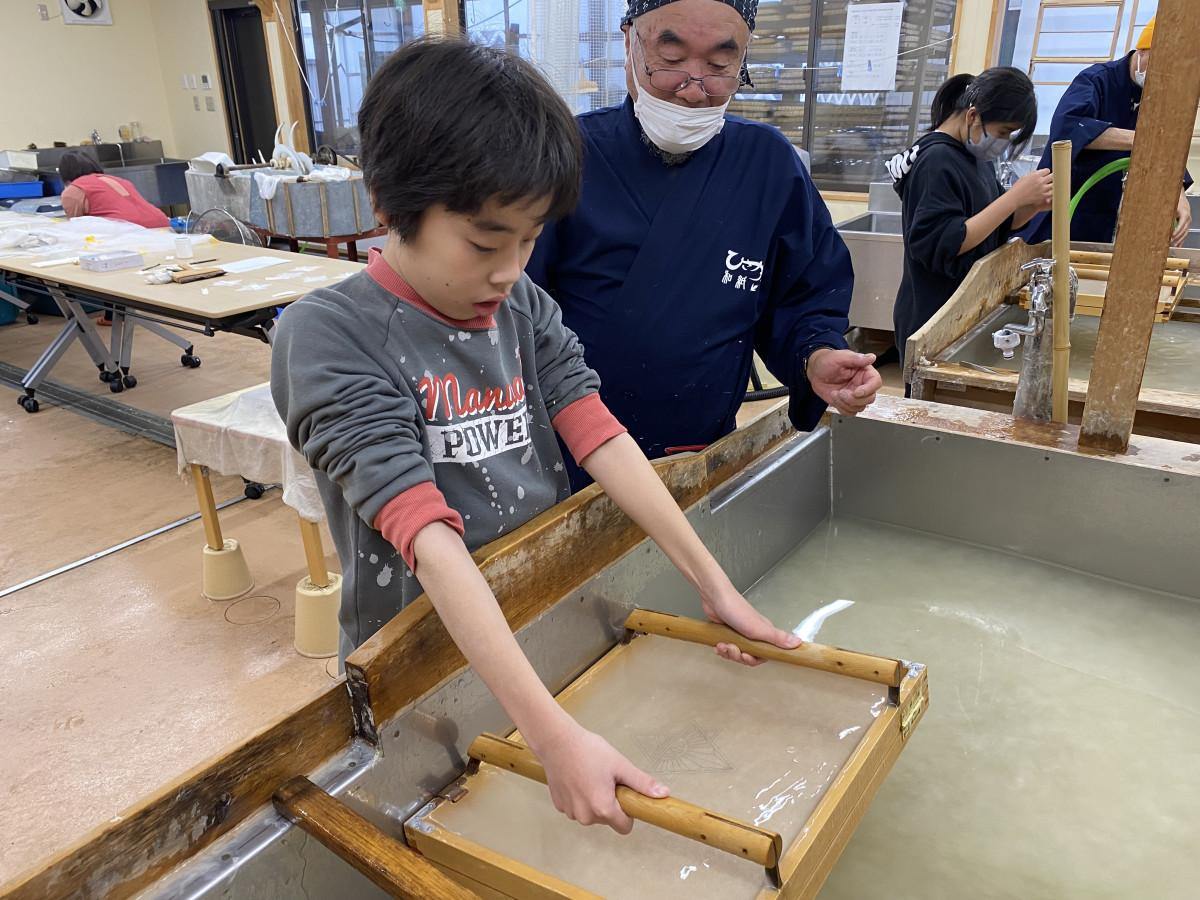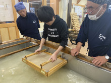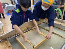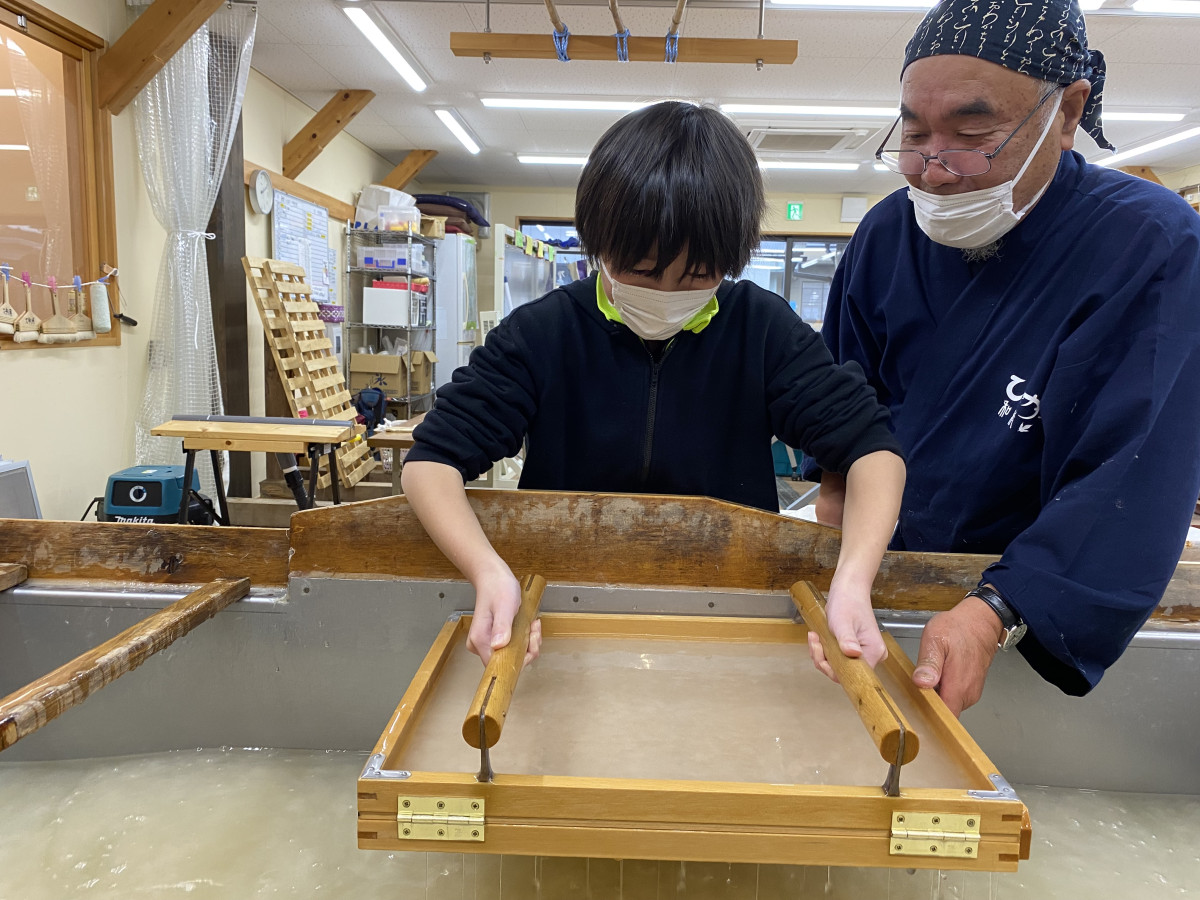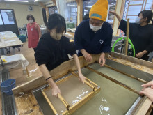 下久堅小学校(飯田市下久堅知久平)の6年生の児童が12月17日、ひさかた和紙の里紙屋(同知久平)で「ひさかた和紙」の紙すき体験を行った。