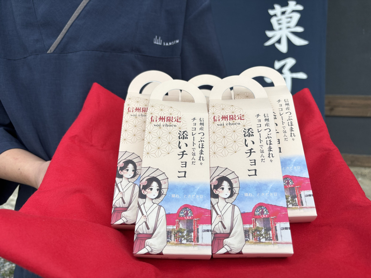 極大粒の大豆「つぶほまれ」を使った新商品「添いチョコ」を、洋菓子製造販売の「山山SANSEN(さんせん)」(飯田市桐林)が10月1日に発売した。
