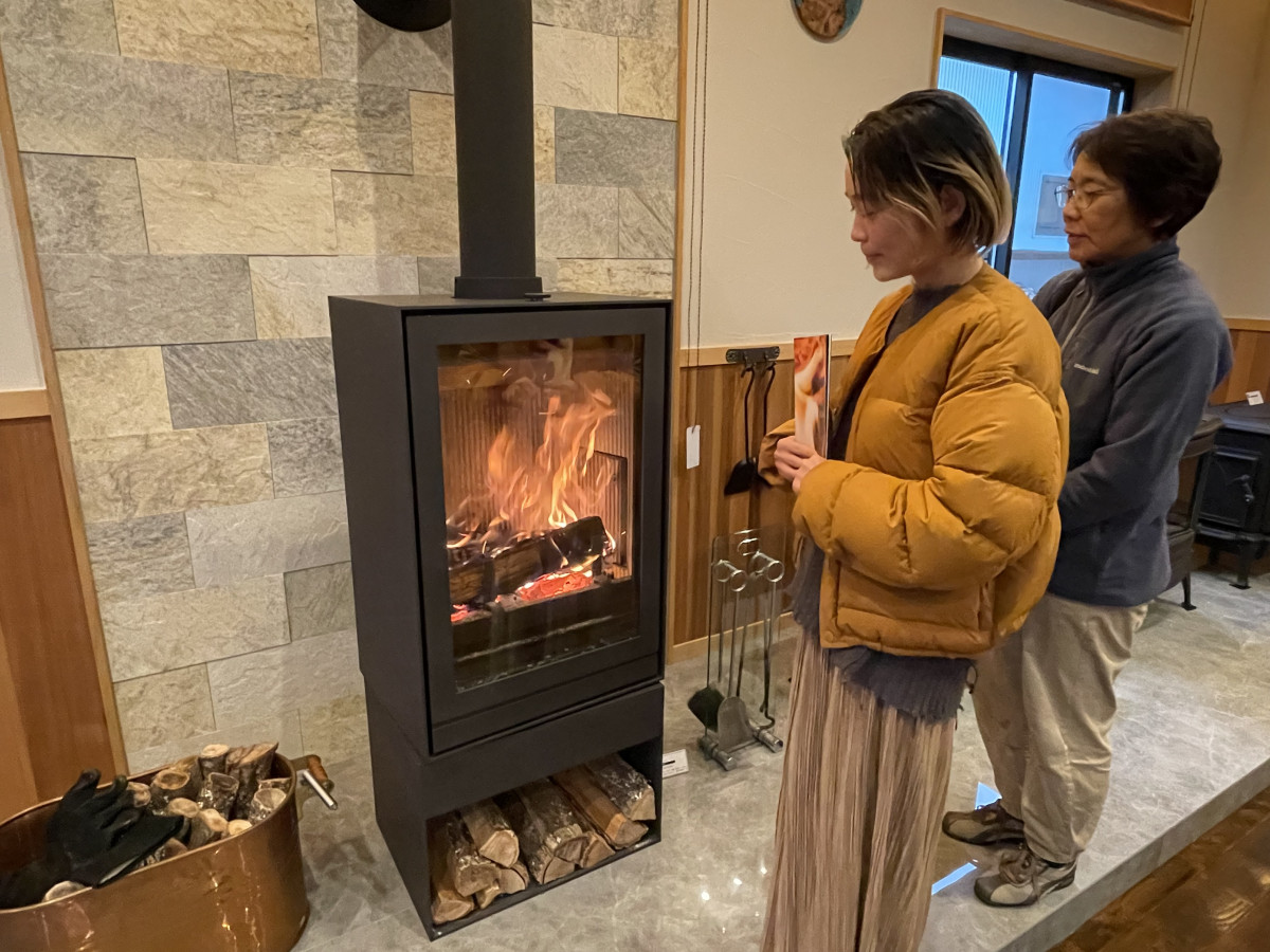 ストーブ屋ドットコムのショールームでまきストーブを体感する女性客ら