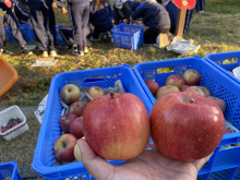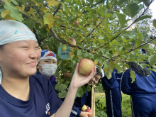 飯田東中学校(飯田市高羽町)が11月17日、飯田市中心市街地のリンゴ並木で「収穫を祝う会」を開き、今年最後の収穫作業を行った。