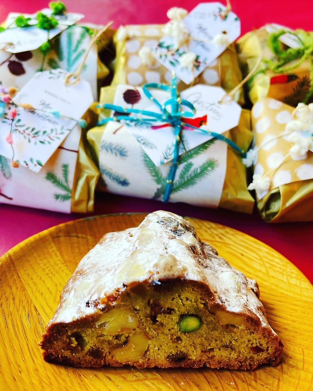 ピスタチオプードルをふんだんに使ったぜいたくな焼き菓子」、クリスマス菓子「シュトーレン」
