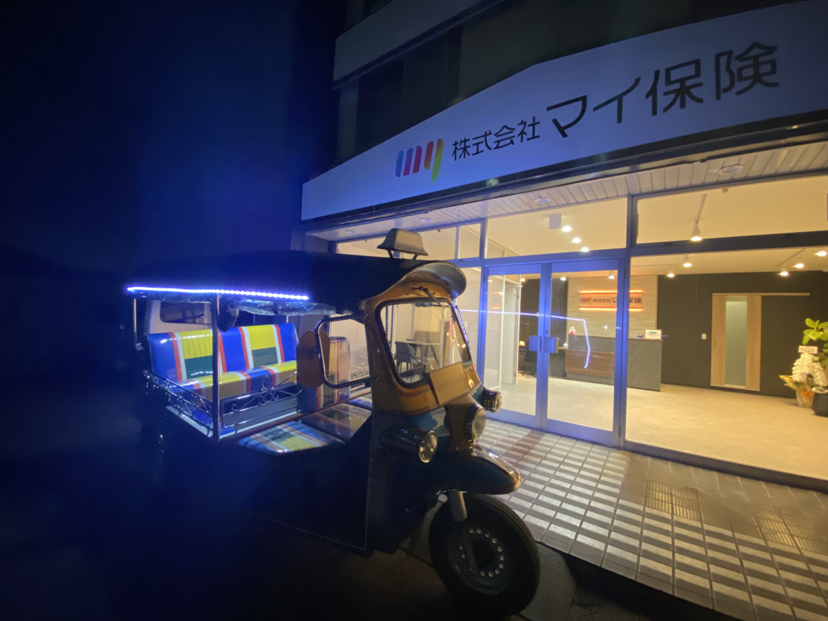 保険代理店「マイ保険」が12月1日、飯田市上郷別府への移転をきっかけに、タイのタクシーなどで使われる乗り物「トゥクトゥク」を導入した。