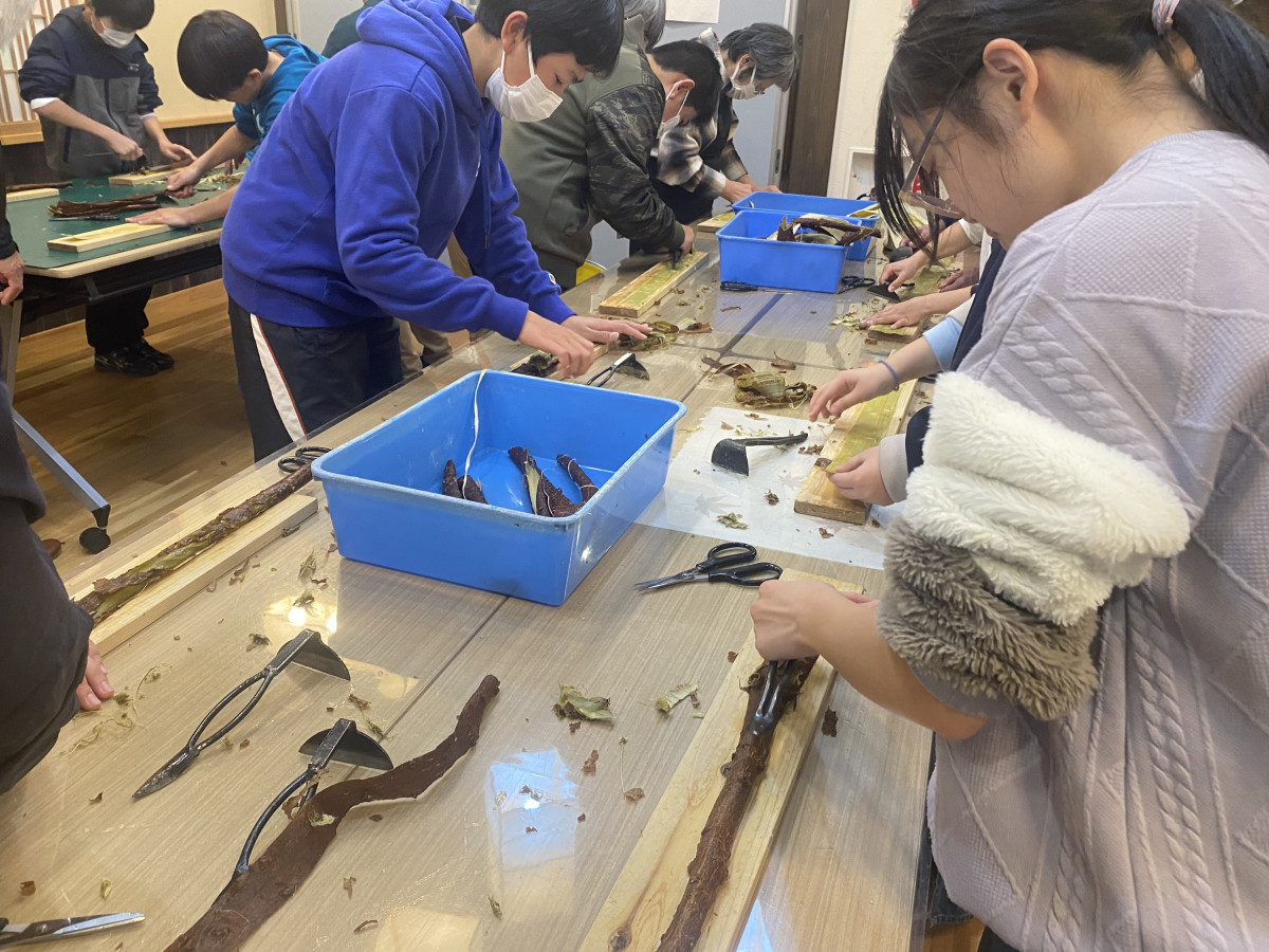 下久堅小学校(飯田市下久堅知久平)の6年生の児童が12月17日、ひさかた和紙の里紙屋(同知久平)で「ひさかた和紙」の紙すき体験を行った。