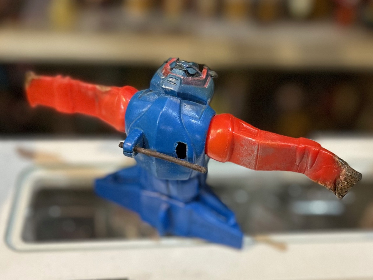 こたつの中に入れていたため片腕が熱で溶け車輪が取れてしまったが、現在もそのまま店内に展示する