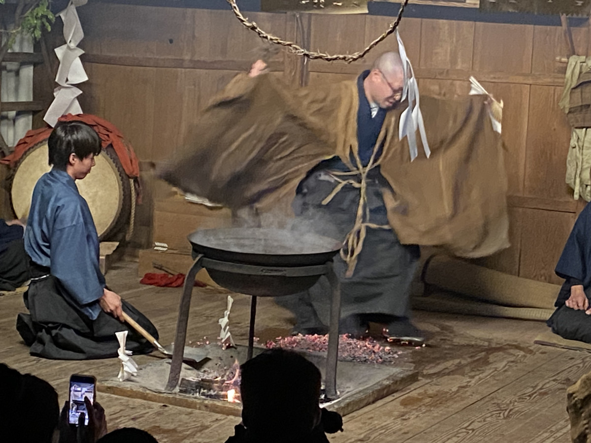 国の重要無形民俗文化財で、天龍村向方(むかがた)地区で古くから伝わる湯立て神楽「向方お潔(きよ)め祭り」が1月3日、「天照皇大神宮(てんしょうこうたいじんぐう)」(天龍村向方)で行われた。