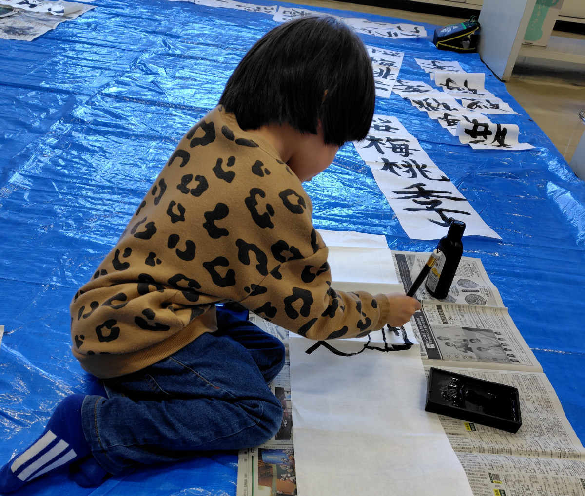 飯田の子育てサークル「わんぱくだん」が1月6日、松尾公民館(飯田市松尾城)で「書き初め会」を開いた。