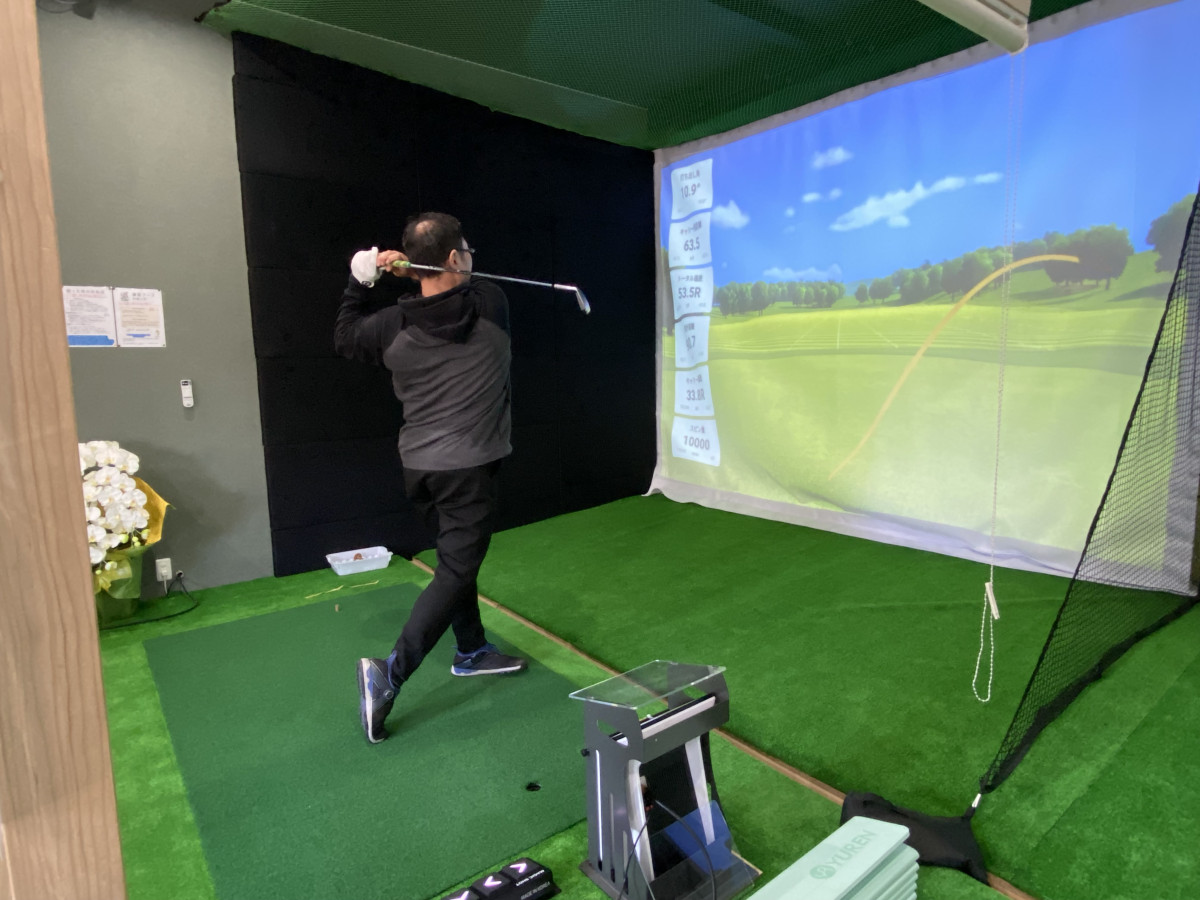 ゴルフ練習ブースでスイングする山口さん