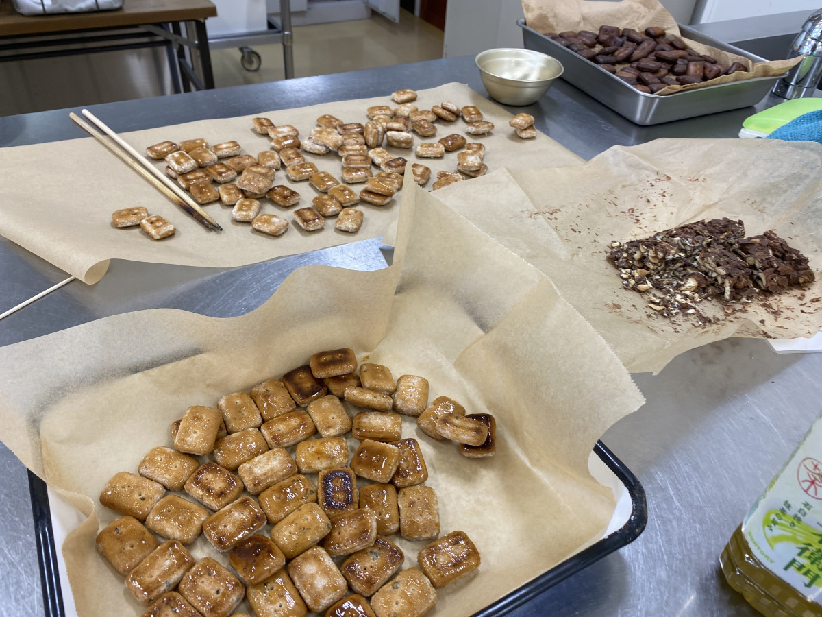 完成した「飴がけカンパン」と「カンパンのチョコレートバー」など