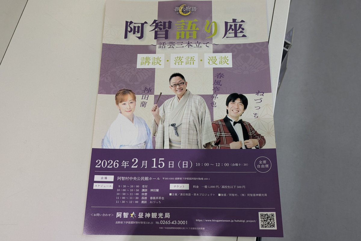 阿智村中央公民館(阿智村駒場)ホールで2月15日、話芸イベント「阿智語り座 話芸三本立て~講談・落語・漫談~」が開催される。