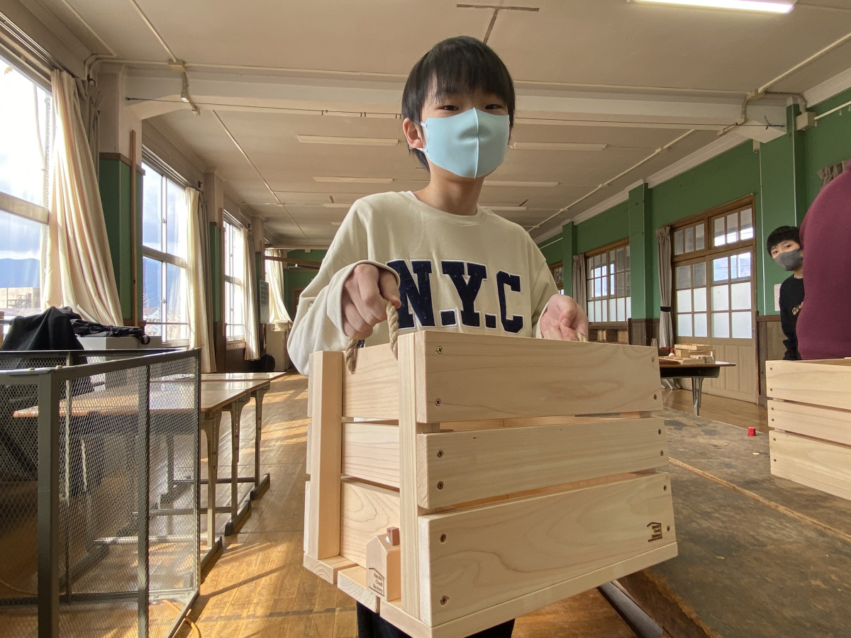 追手町小学校(飯田市追手町)にある支援学級「フレンドリールームなかよし」に通う小中学生の生徒児童6人が2月27日、地元の井坪工務店(飯田市上郷黒田)の指導の下、収納ボックスの製作に取り組んだ。
