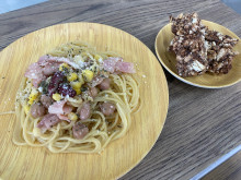 完成した水吸いアレンジパスタと乾パンスティック