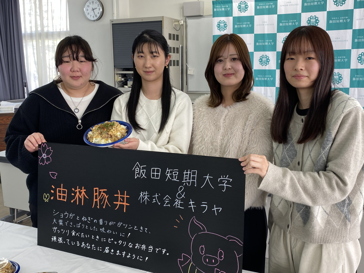 地元商品を中心に取り扱うスーパーチェーン「キラヤ」(飯田市松尾上溝)が3月25日、飯田短期大学の学生と共同開発した「油淋豚丼(ユーリントンドン)」の販売を飯田下伊那地区の8店舗で始めた。