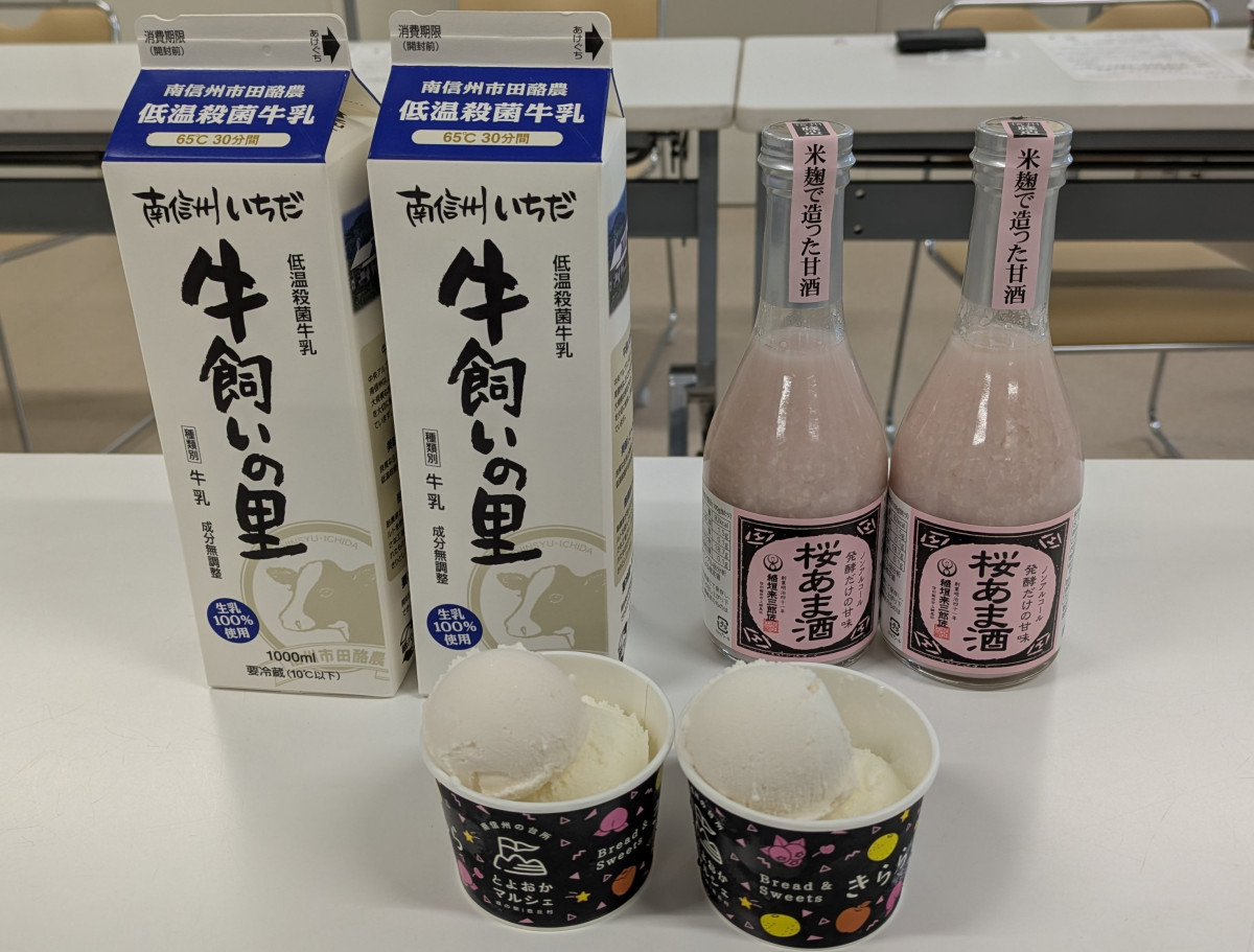 材料となった「牛飼いの里」、「桜あま酒」と「桜甘酒ジェラート」