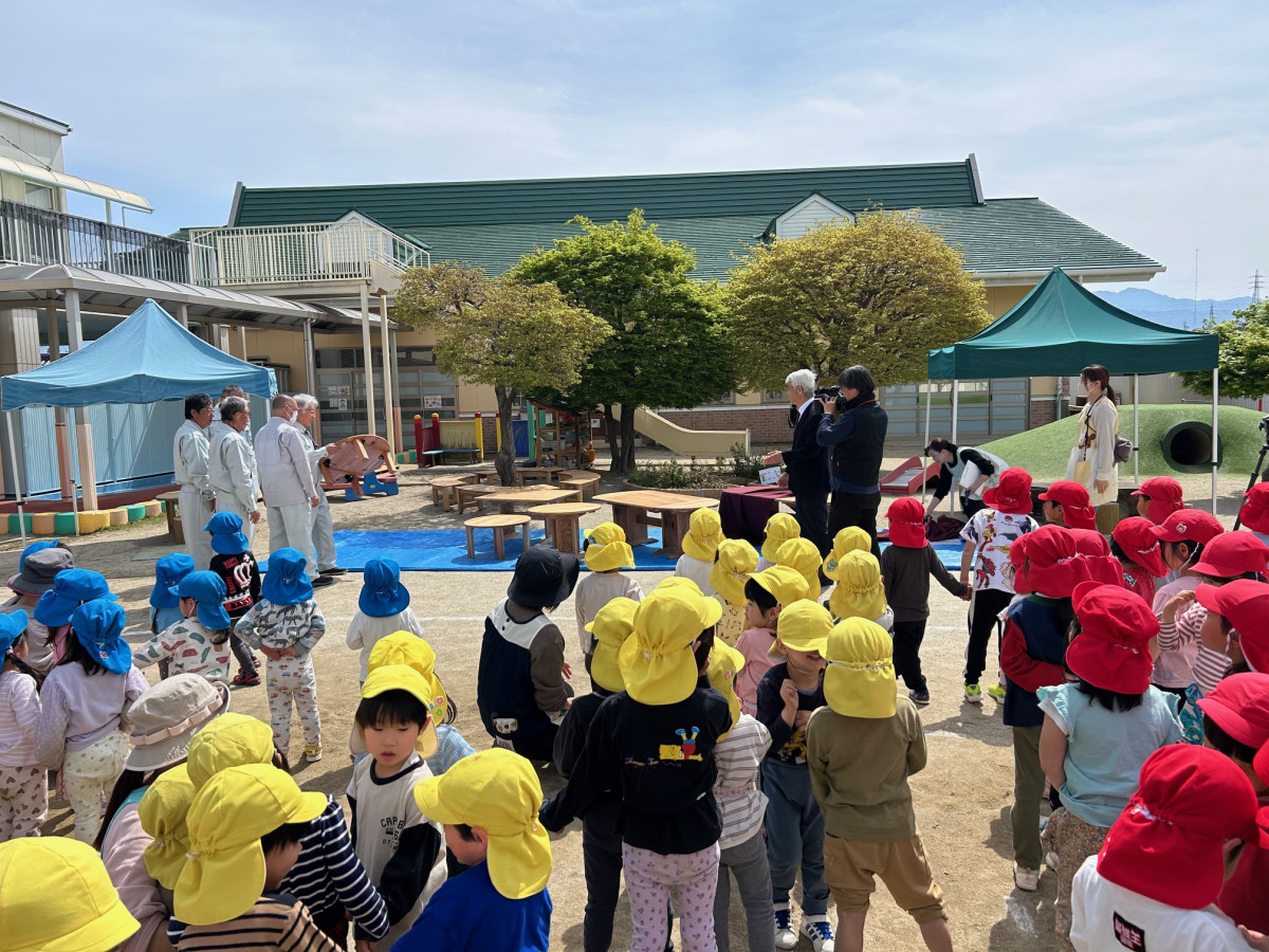 飯田市松川入財産区が4月17日、明星保育園(飯田市鼎切石)で木製ベンチなどの贈呈式を行った。