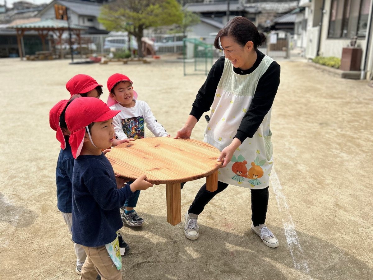 飯田市松川入財産区が4月17日、明星保育園(飯田市鼎切石)で木製ベンチなどの贈呈式を行った。