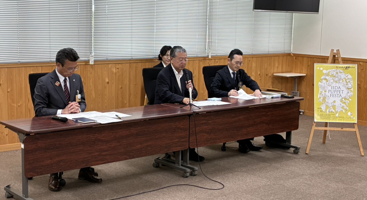 「いいだ人形劇フェスタ2026」ポスター・ワッペン発表記者会見の様子