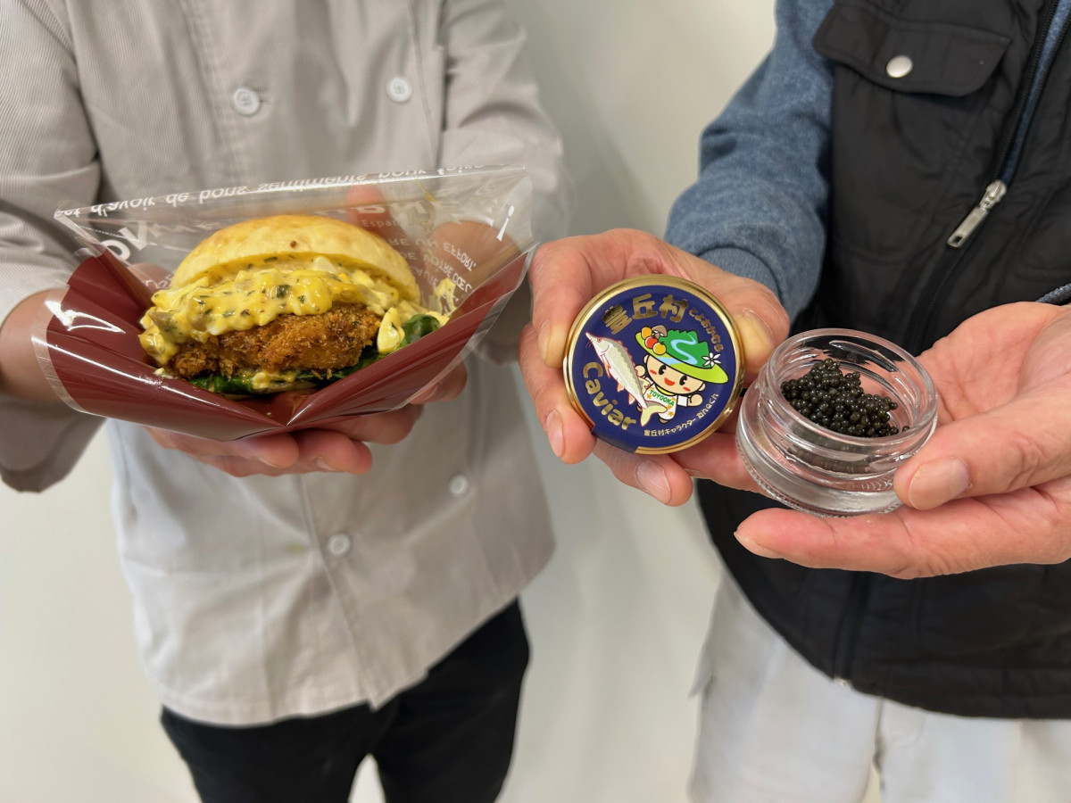 豊丘村の住民有志でチョウザメの飼育に取り組むプロジェクトチームが4月22日、村内で養殖したチョウザメを使った「キャビア」と「ハンバーガー」の発表を「道の駅・南信州とよおかマルシェ(豊丘村神稲)」で行った。