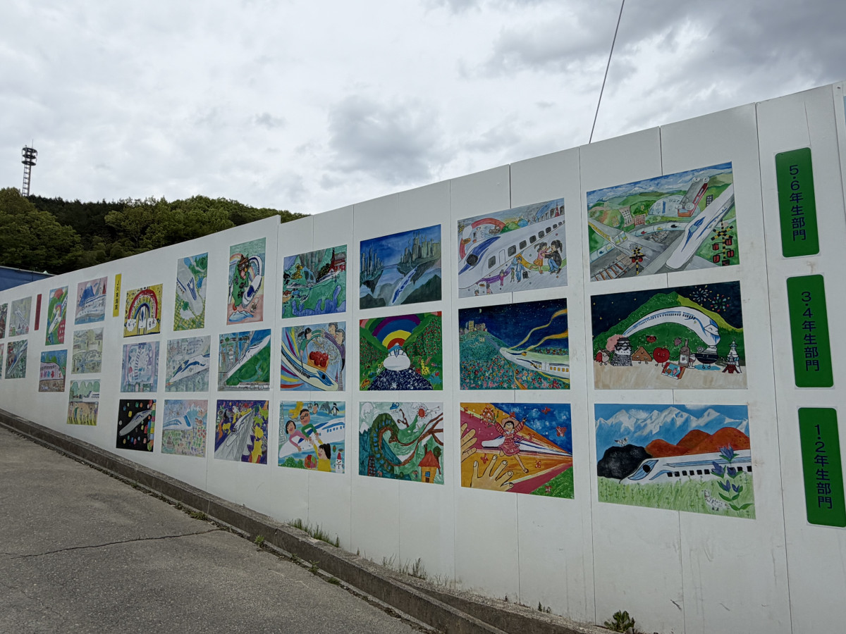 工事ヤードの壁面には子どもたちが描いた絵画も展示